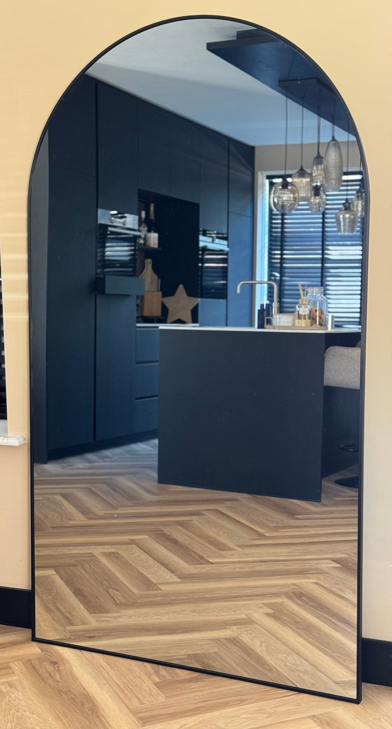 Met een formaat van 180x100 cm biedt deze spiegel een volledig beeld van top tot tiener en zorgt hij voor optisch meer licht en ruimte. Dee afgeronde bovenzijde brengt balans in het ontwerp, wat hem ideaal maakt als grote passpiegel met ronding.