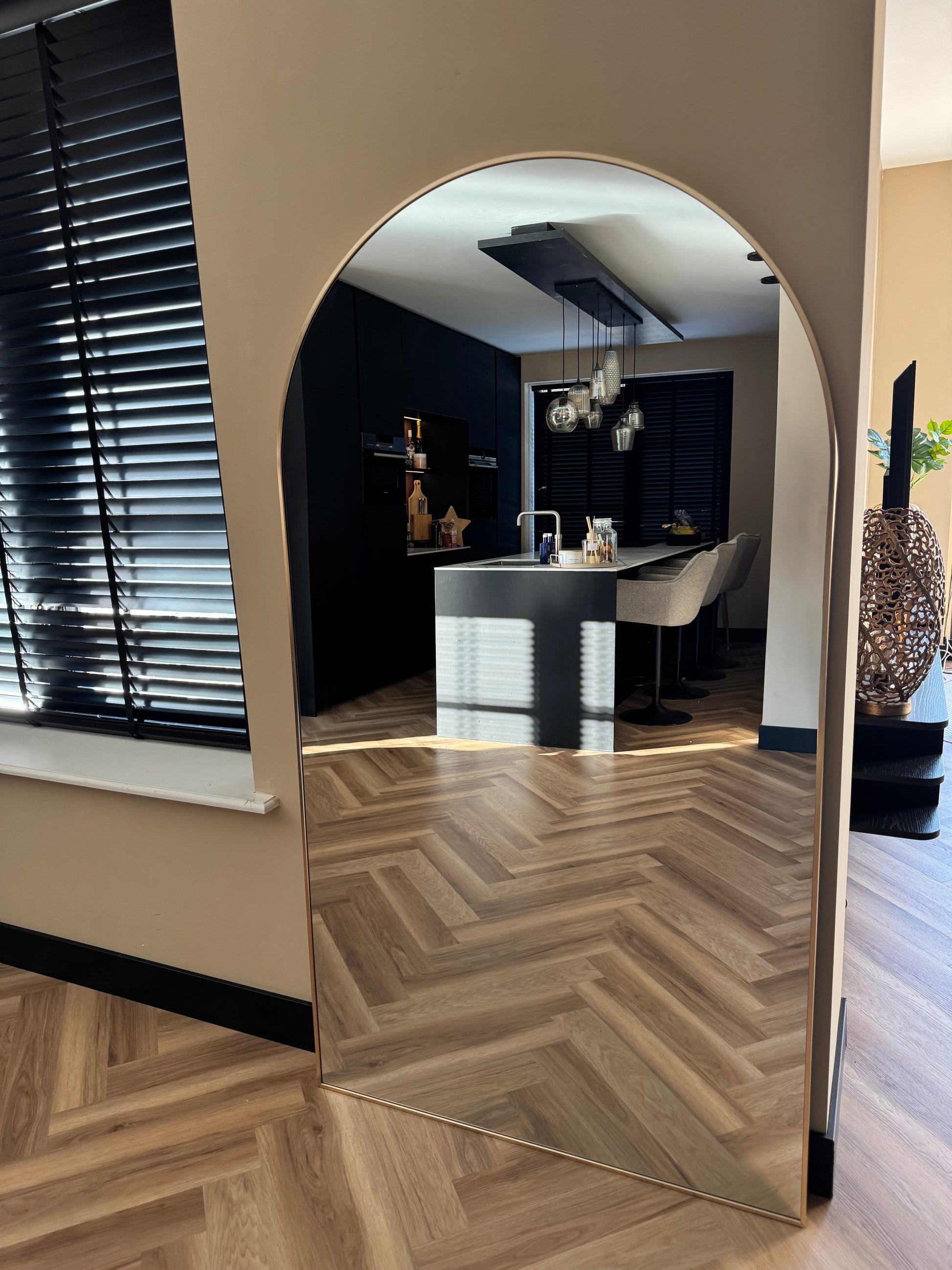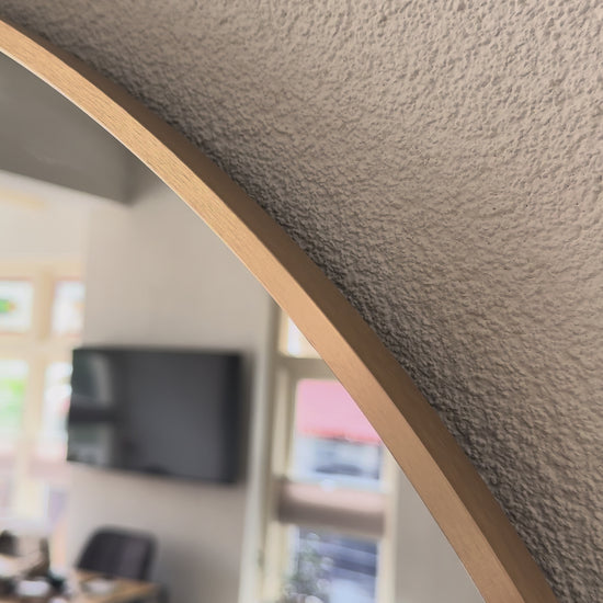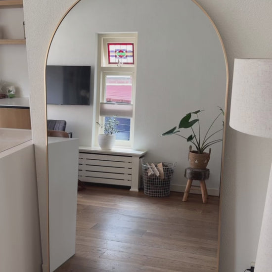 De onderste ronding aan de bovenzijde in combinatie met het brede formaat maakt deze spiegel perfect als grote wandspiegel met ronding. De warme rosé gouden afwerking geeft je interieur een exclusieve en moderne uitstraling – ideaal voor de slaapkamer, hal of luxe garderobe.